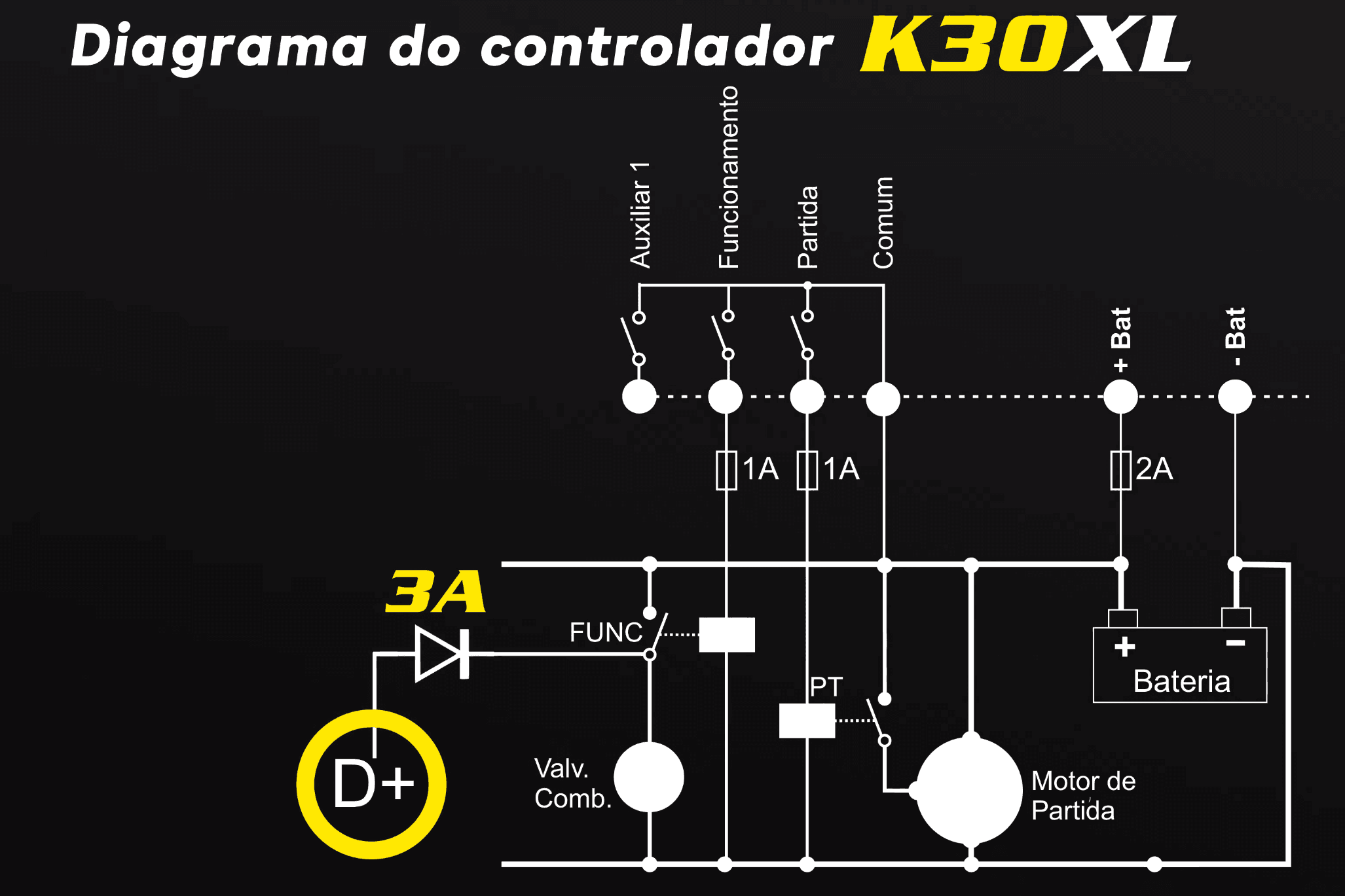 Conecte um diodo de 3A ao relé auxiliar da válvula de combustível, polarizado de forma que o negativo do diodo esteja ligado à saída da válvula de combustível e o positivo ligado ao D+. O diodo permitirá que, ao executar o comando de parada, a válvula de combustível não fique sendo alimentada e também que o D+ receba o sinal positivo que necessita na partida.