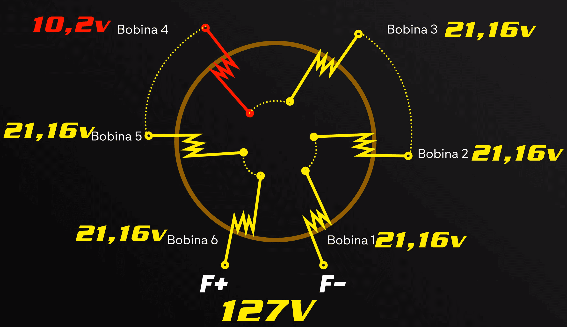 Exemplo: Se a tensão aplicada for 127Vca e houver 6 bobinas, o correto é a tensão por bobina ser de 21,16 Vac. A bobina que apresentar um valor muito discrepante em relação ao cálculo (muito menor), é a bobina que está entrando em curto e com isso deverá ser rebobinada.